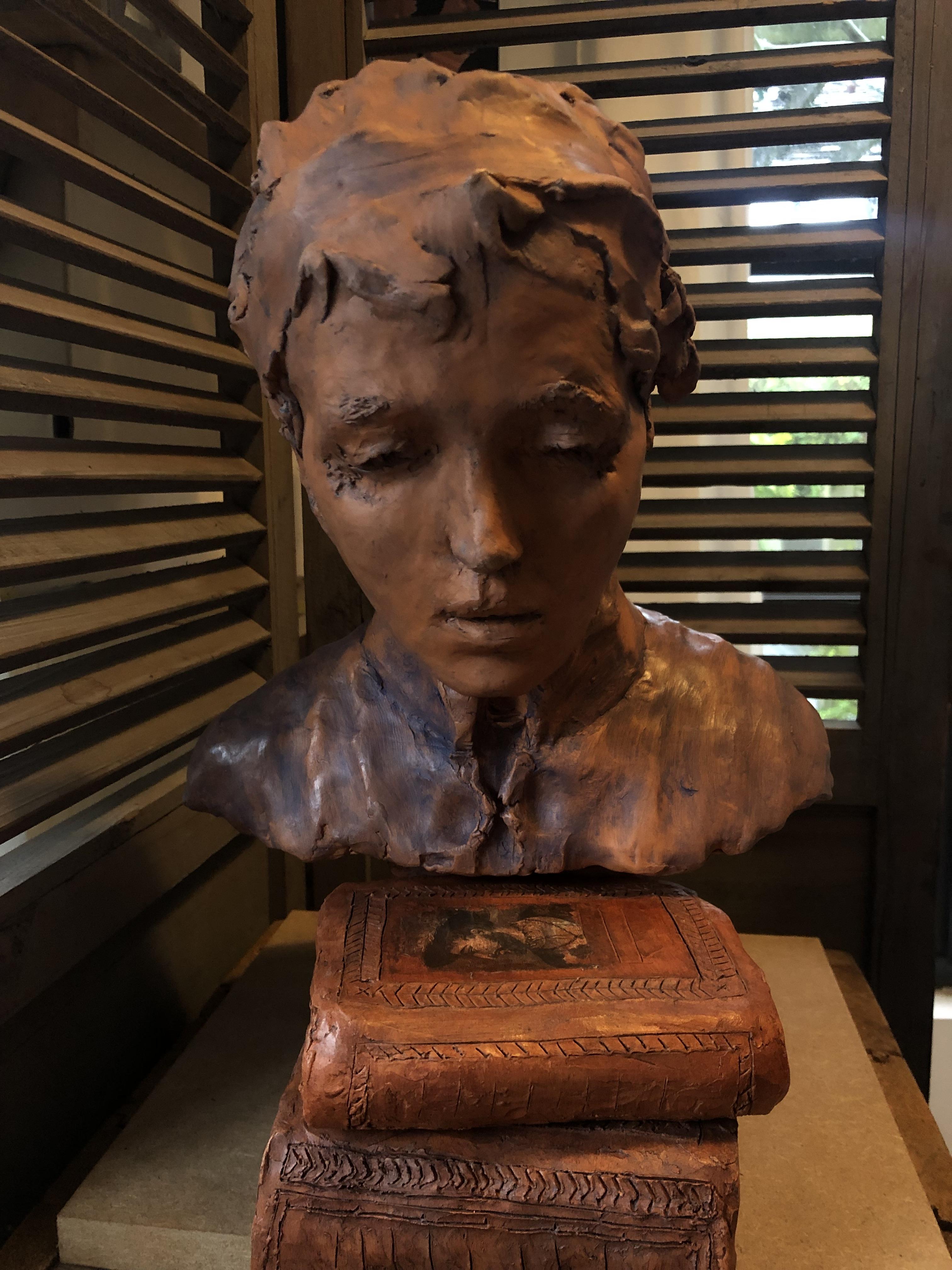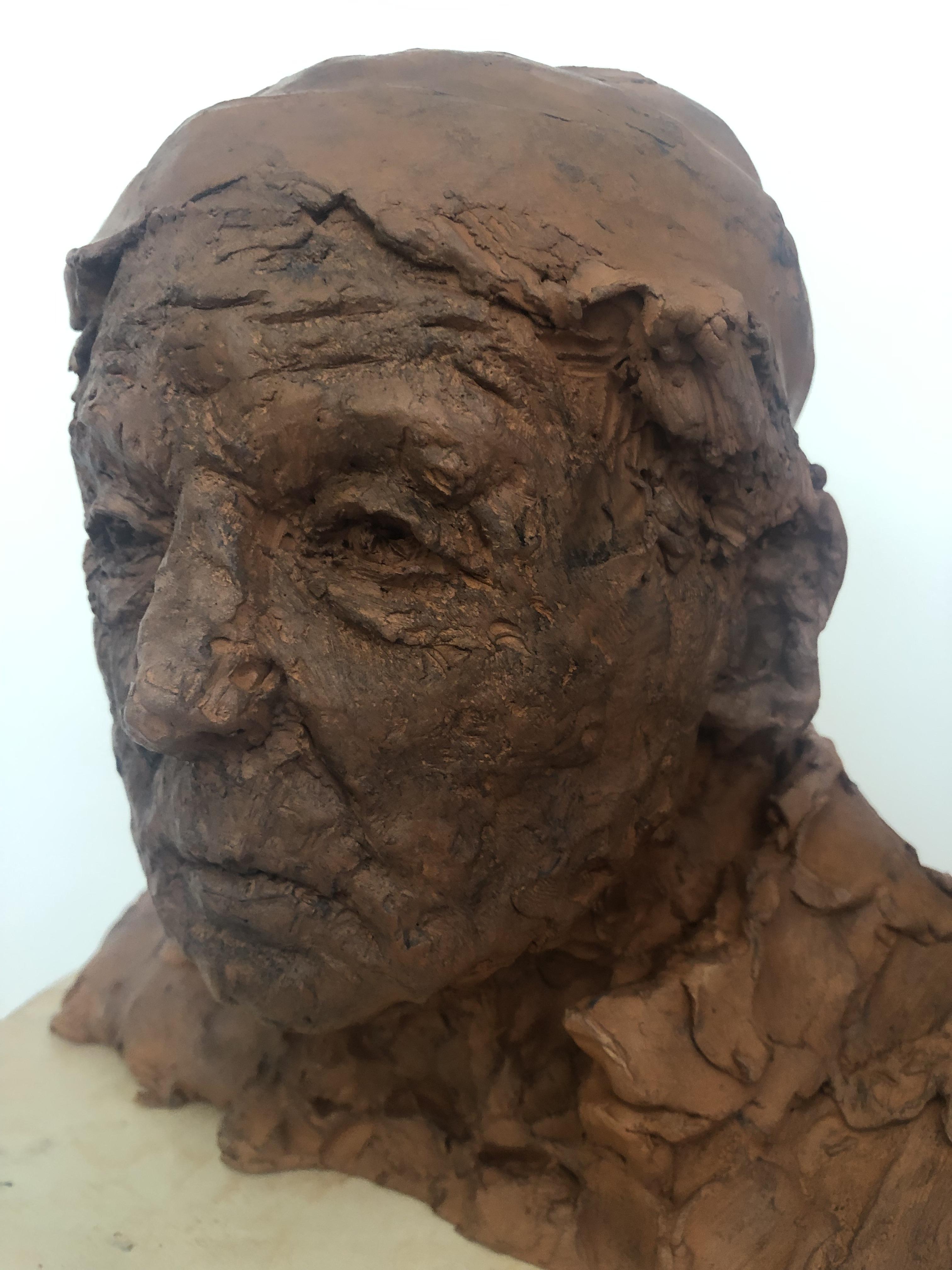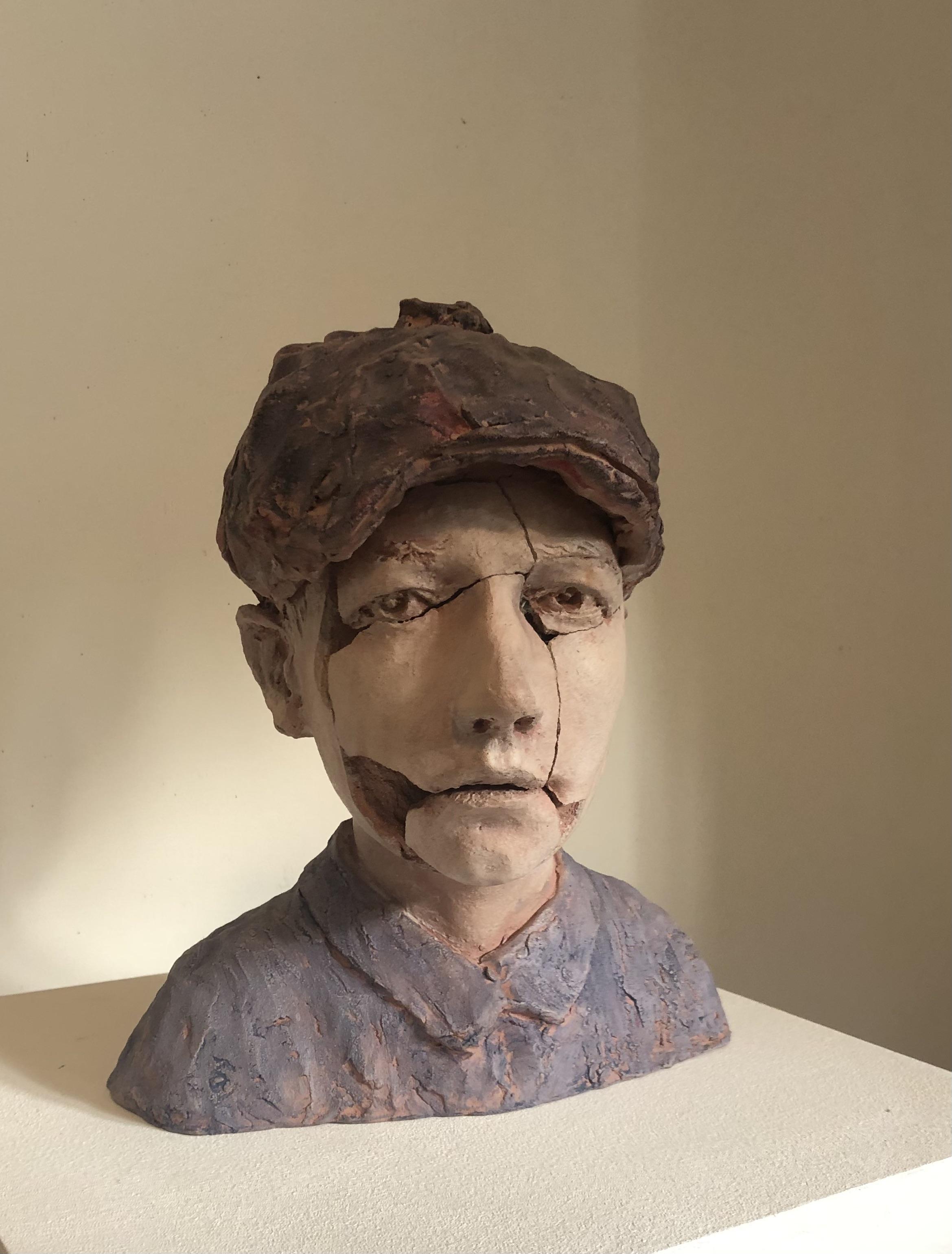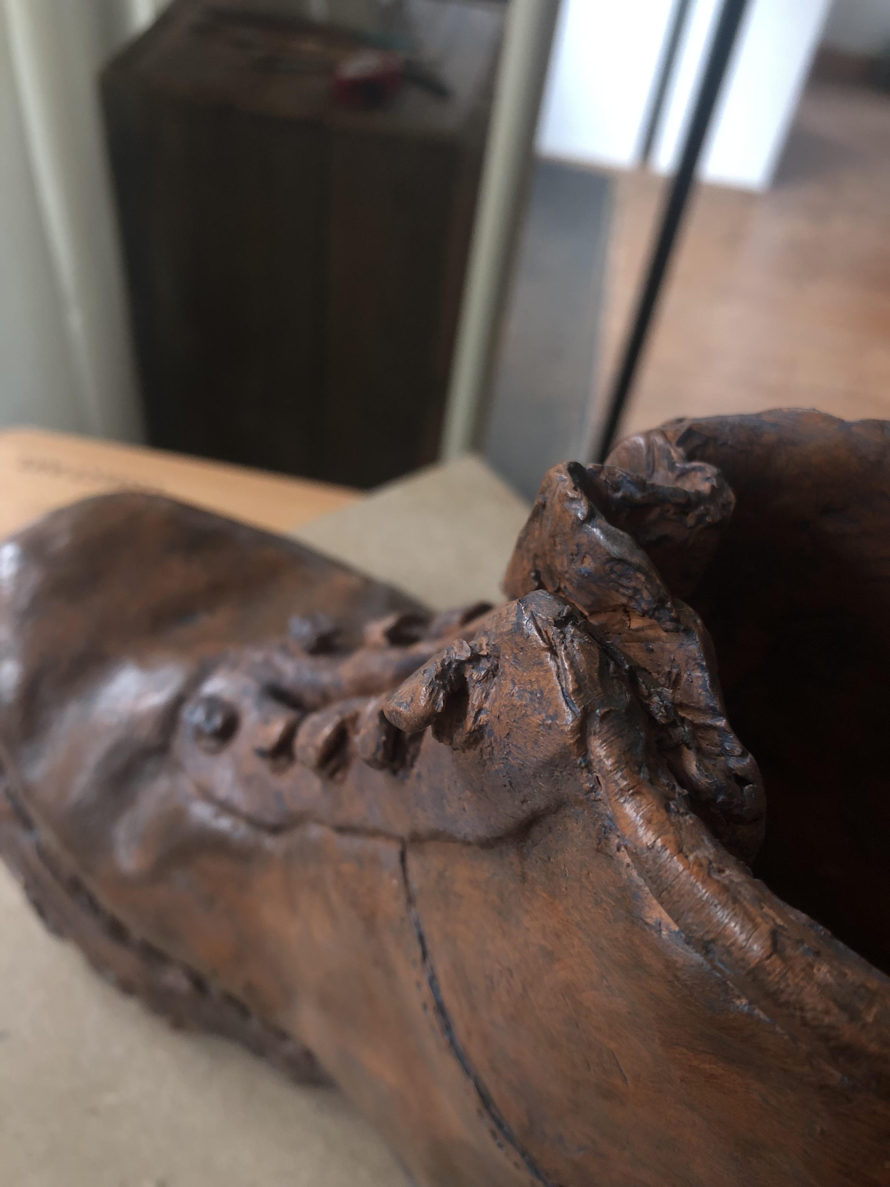 « Le modelage, c’est d’abord le contact de la terre, le plaisir de la travailler, de la façonner. Après la cuisson, je retravaille la terre cuite à la cire pour lui donner un aspect patiné. Les différentes teintes de cirage vont me permettent de renforcer par exemple les expressions du visage ou encore l’impression d’un cuir usé pour une vieille chaussure. L’idée est que chaque réalisation puisse nous permette de nous raconter une histoire… »