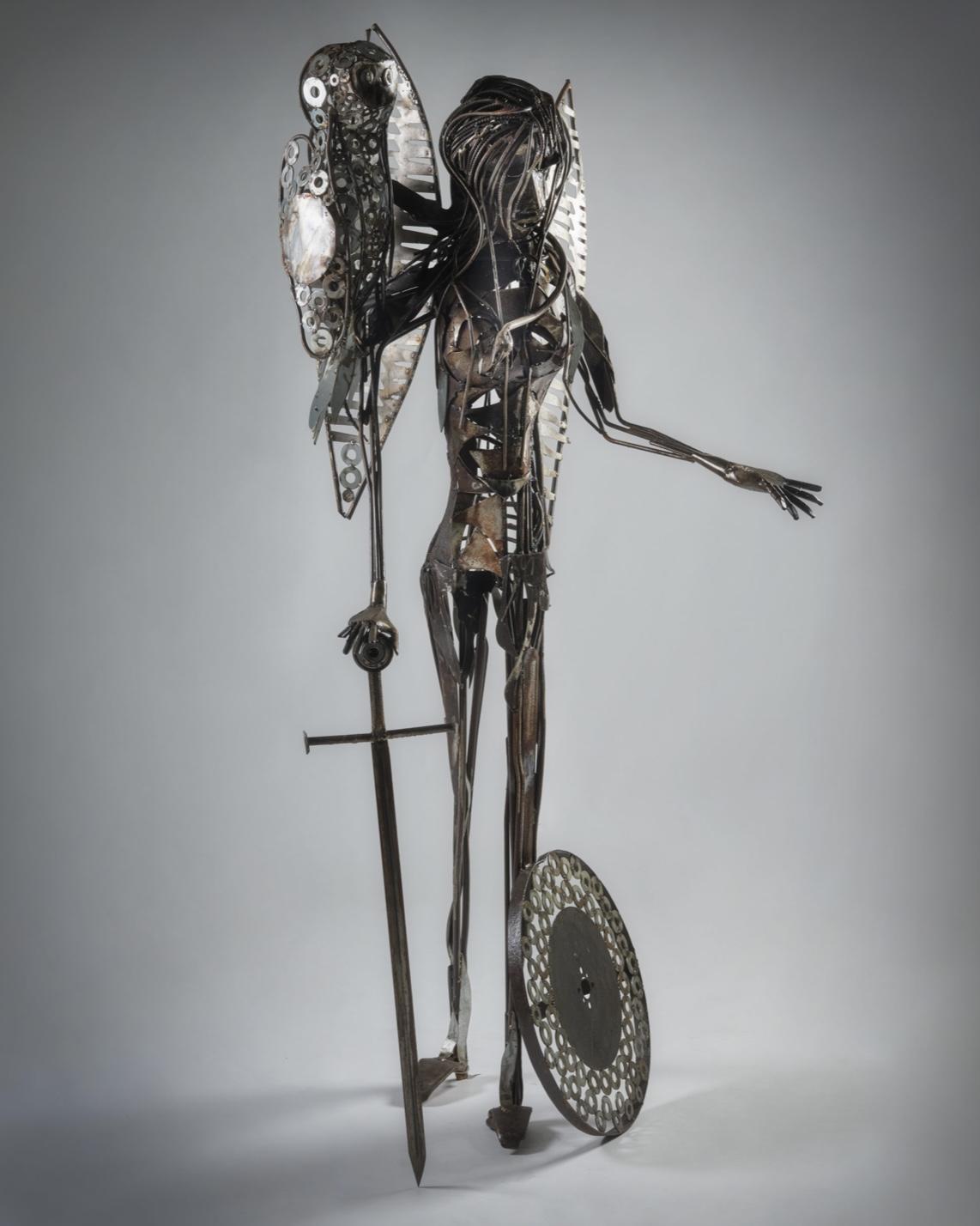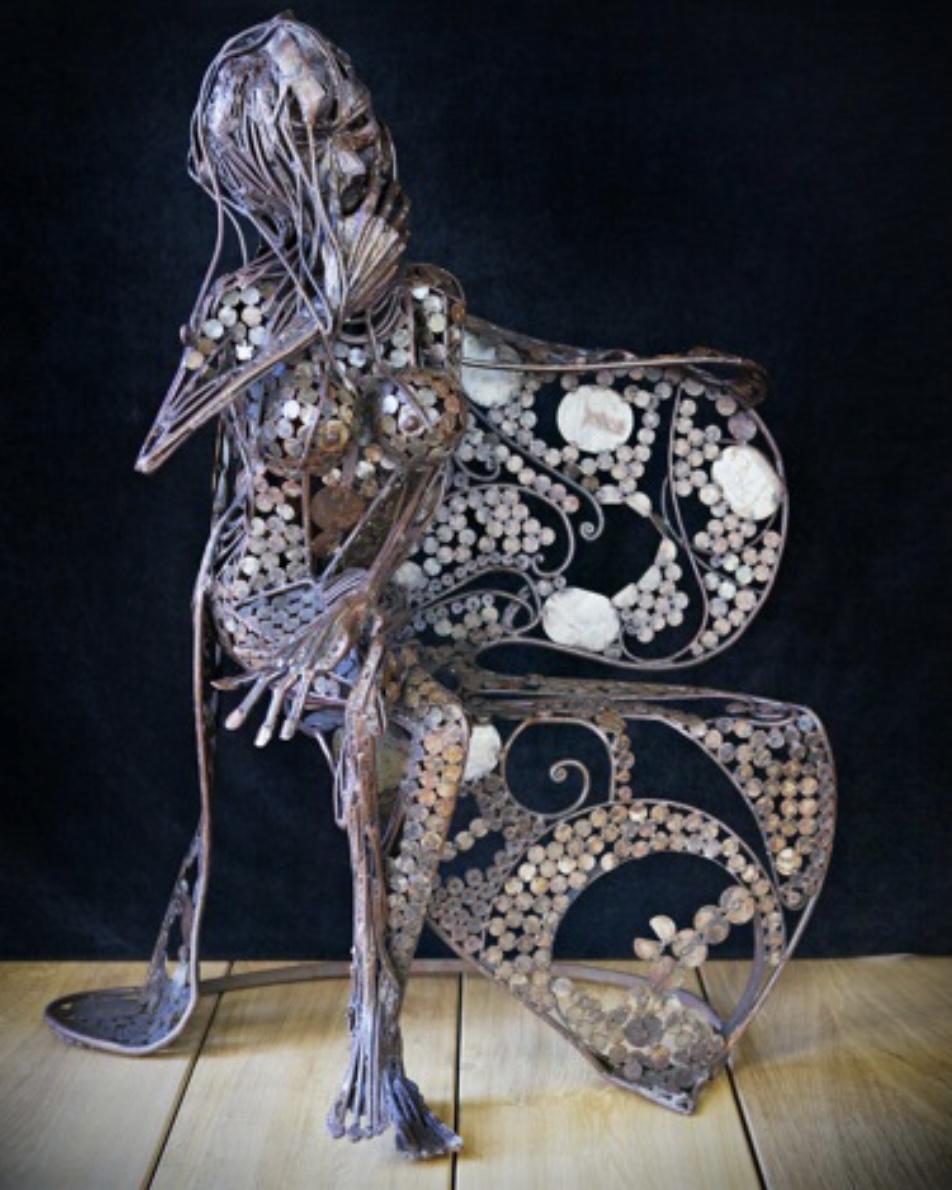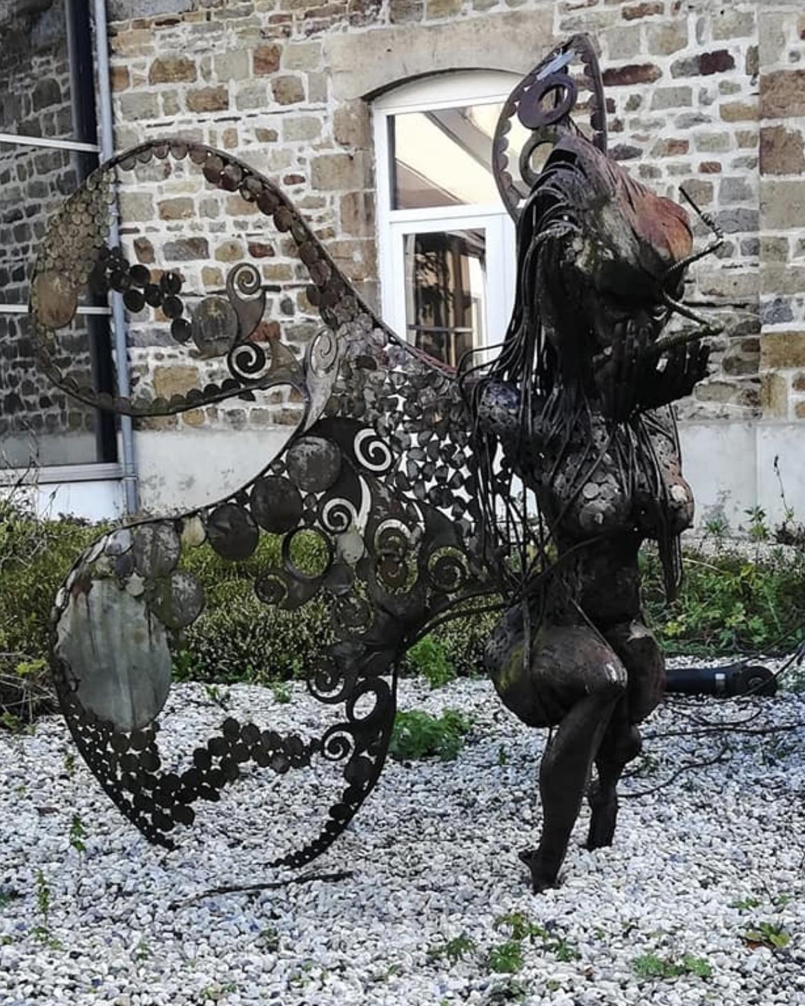 « Je suis sculptrice sur métal, j’utilise les mêmes techniques que « les métalliers » (soudure, meulage…) et la même matière : le métal (appelé familièrement la ferraille). Il m’arrive également d’utiliser la forge (je chauffe le métal). Mes sujets d’inspiration sont la condition humaine et sa complexité. Ma matière principale est les émotions ainsi que les miennes ; je puise aussi beaucoup dans le domaine de la symbolique pour chercher à exprimer celles-ci et ainsi, les partager avec celles des autres. »