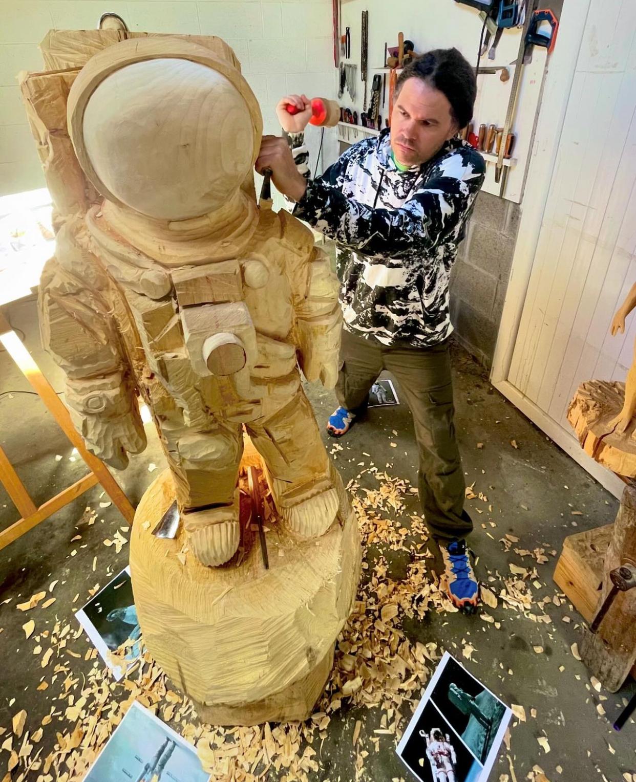 « Après avoir vécu une enfance au coeur des arbres, à construire des cabanes, à fabriquer des jouets en bois dans l’atelier de mon grand-père ; c’est tout naturellement que je me suis approprié le bois comme matériau unique de mes sculptures ; mais également cette technique de la taille directe. Ce procédé technique primaire ancestral consistant à soustraire pour faire apparaître, créer du vide pour rendre visible. Entraîner l’absence pour donner naissance. Dans ma pratique les formes sculptées sont toujours intimement liées à la matière, au bloc originel puisque taillées en son coeur ; comme incrustées dans le bois. J’aime surprendre en associant un réalisme des formes sculptées à un aspect brut de la matière, une précision du geste à une certaine violence des coups dont la trace reste souvent visible. »